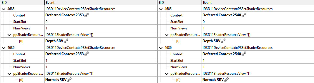 Multiple views! This starts to look very much like what Baldur described – a read/write hazard. Thus, the next thing we need to do is find the D3D11 call binding output buffers for that draw, and compare its context. Here’s how it looks before the patch: