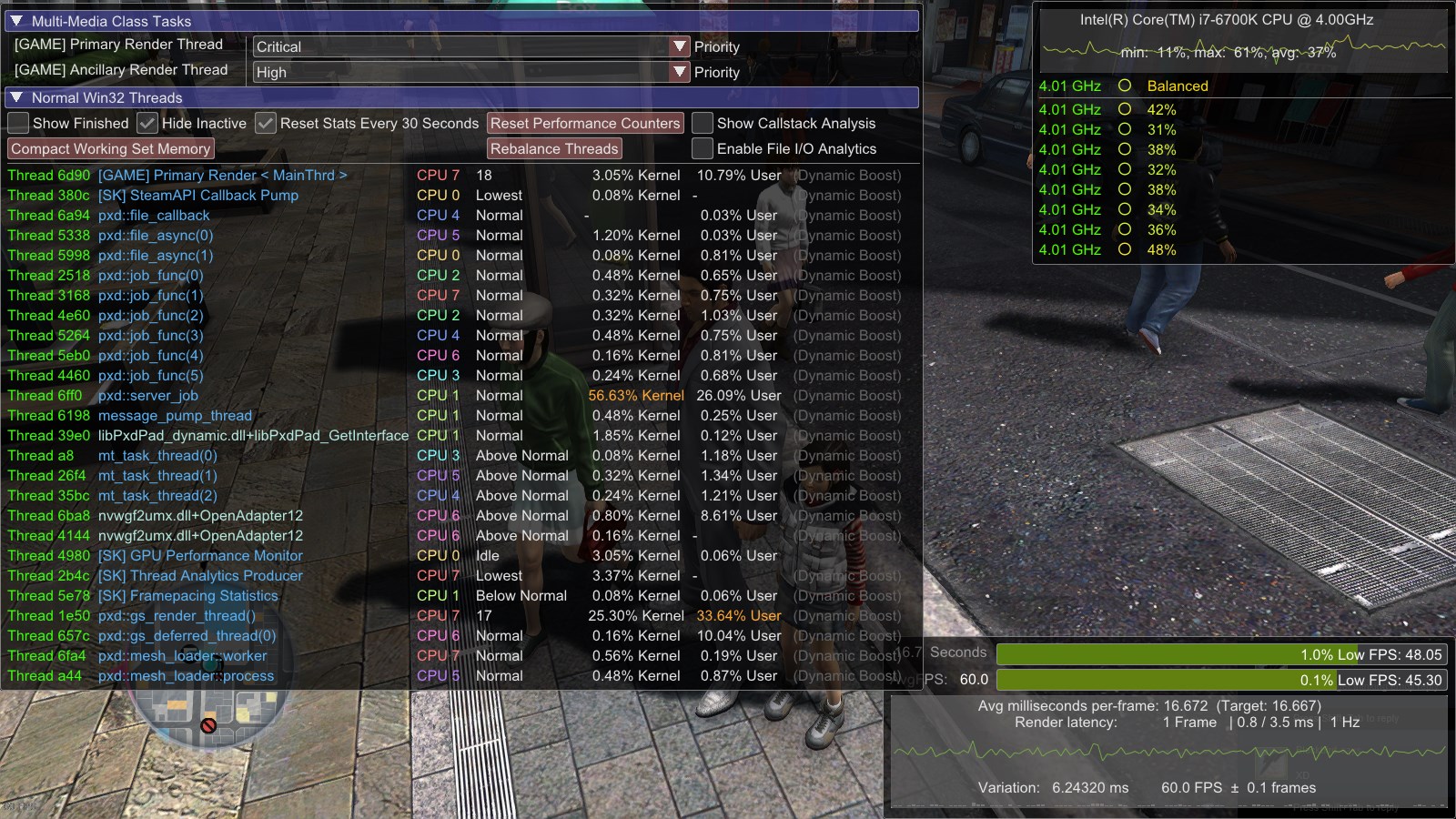 Sleep(0)to idle threads, but that ends up not giving away CPU time to other threads if there is no other thread (at the same or higher priority level) ready, and thus in practice threads end up spinning for no apparent reason. In this case, I settled for a mixed solution – non-time-critical threads regain CPU time properly by usingSleep(1)instead, while the frame limiter loop now usesSwitchToThread()to yield only when it is possible. This keeps the frame limiter loop spinning the CPU, but the other threads don’t. Most notably, the current worst offender,pxd::server_jobstopped hogging the CPU in Yakuza 3.