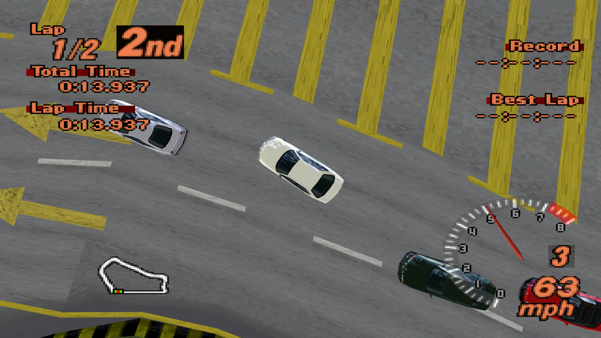 I also attempted to give AI cars their own engine sounds, but this causes the emulated console… to run out of audio RAM! Unlike normal RAM, it’s impossible to expand it so that improvement will probably not be realized anytime soon, if ever.