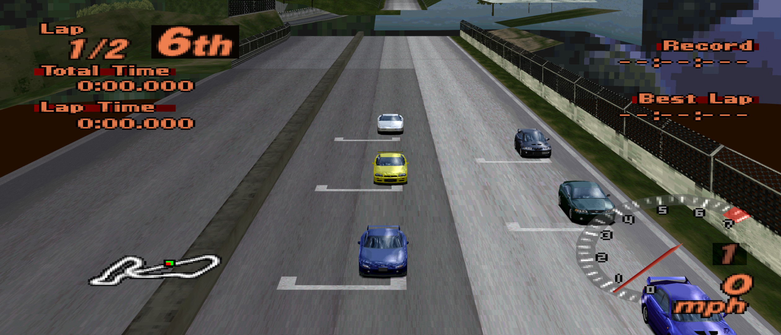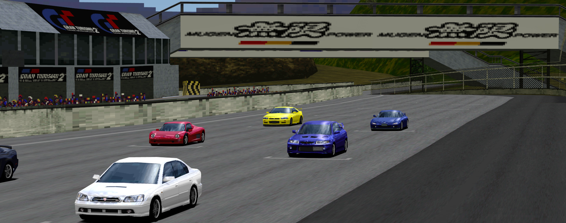 Fair warning – this cheat doesn’t do wonders. The game’s draw distance is determined by the track data itself, and so it’s impossible to increase it arbitrarily. However, Gran Turismo 2 has a slightly higher draw distance in replays than it does in races. With this cheat, I enabled the replay draw distance in races. Curiously, one of the things it “fixes” is a notorious hole in the ground at the start of Midfield!