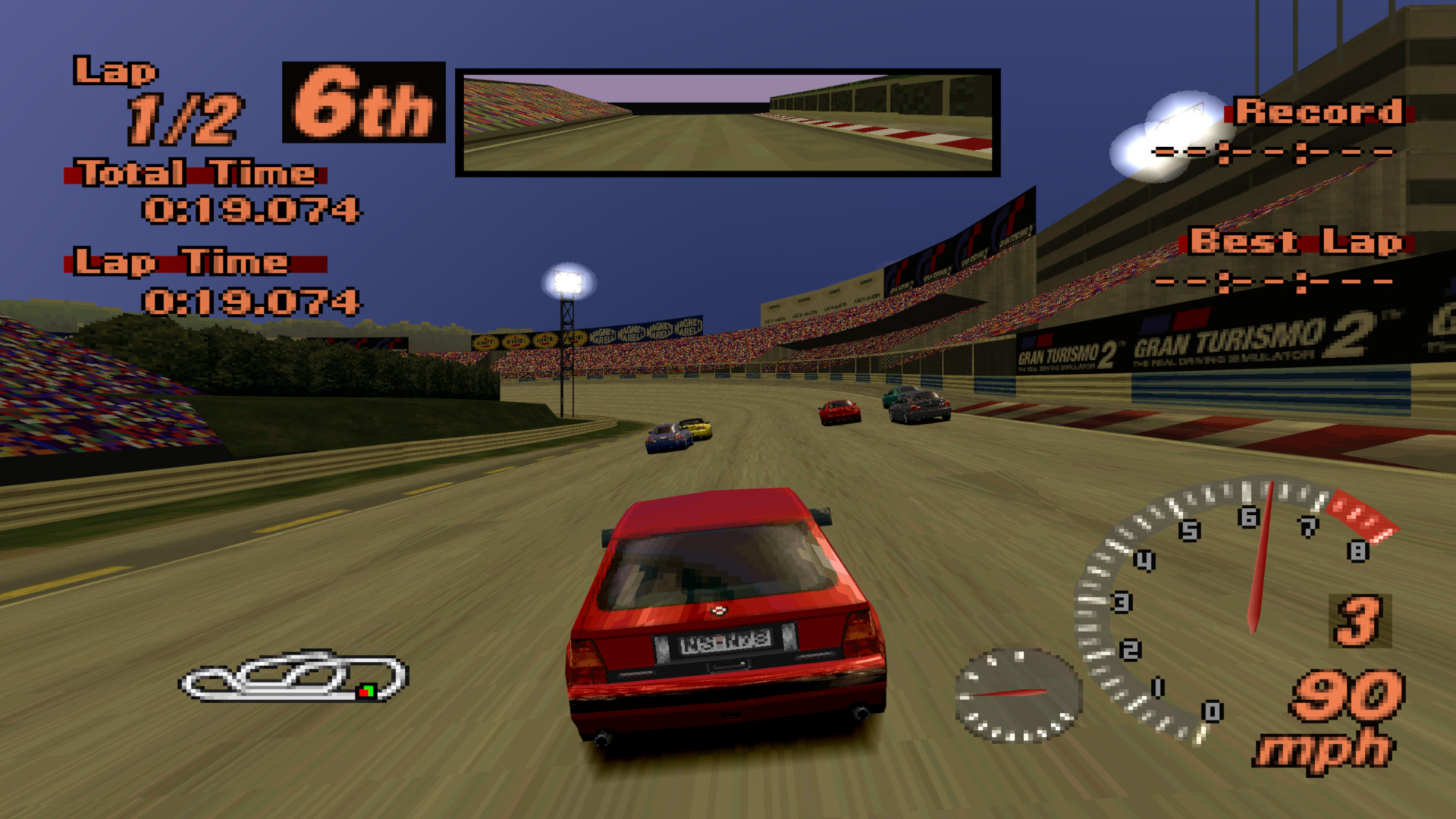 By default, Gran Turismo and Gran Turismo 2 both use very aggressive LODs for AI cars. The player’s car is locked to the highest LOD level, while AI cars cycle between three LDO models depending on distance from the camera. When playing the game on the native resolution it’s nearly impossible to notice, but of course with upscaling LODs become much more obvious and jarring.