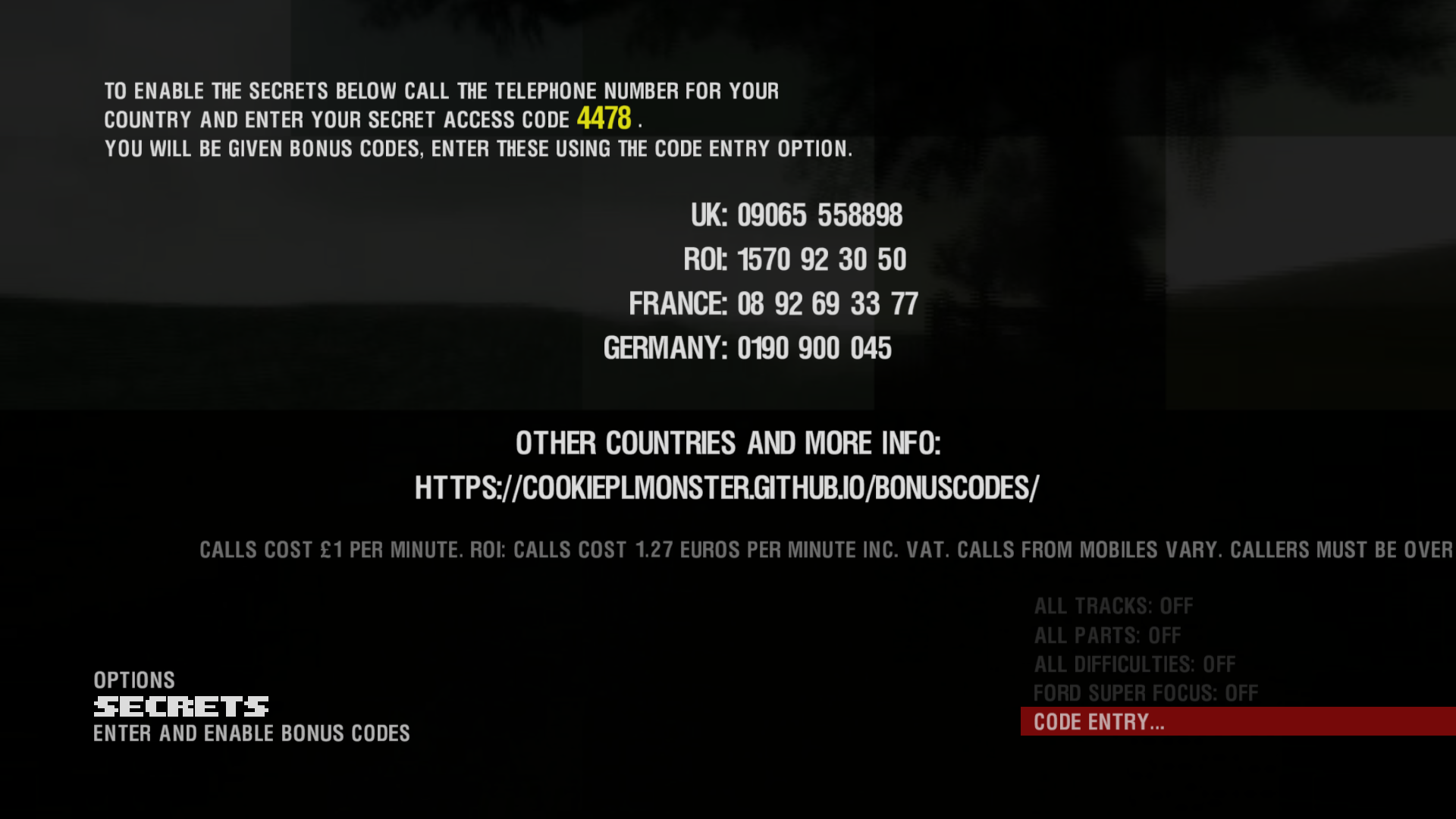 To recap – Bonus Codes was a Codemasters’ take on traditional cheat codes. While most other games had specific cheat codes published by the developers online and in the gaming magazines, Codemasters invented a system where players could buy their “personalized” cheat codes online or through a phone helpline. For example, that’s how this looked in Colin McRae Rally 3 – the screenshot comes from a game with SilentPatch installed, unmodded games pointed the player towards codemasters.com/bonuscodes/ instead: