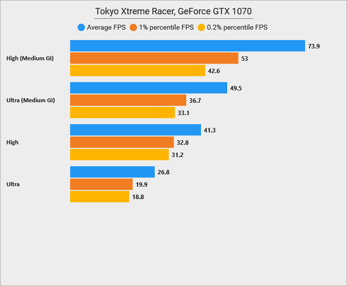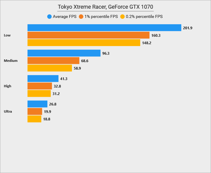 I said earlier that my GeForce GTX 1070 handles the game more than fine at native 1080p, but how is that reflected in metrics? I benchmarked the four graphical presets (at 100% Scaling, as I mentioned at the beginning of the previous section) in a 45-second long drive around the C1 Inner Loop, starting outside and heading through multiple tunnels.
