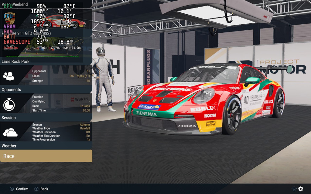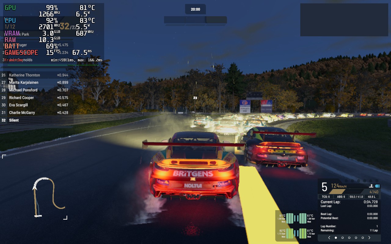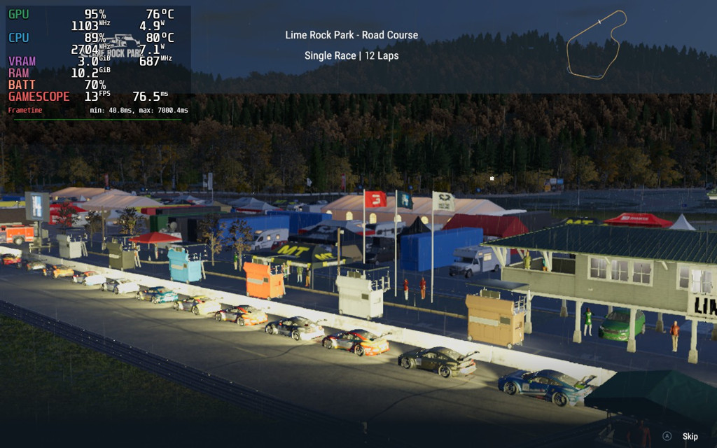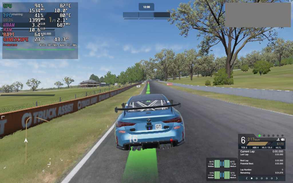 The issue with the Steam Deck is that even though the game is very scalable on the GPU front, you can’t do much to save yourself if your CPU isn’t up to scratch. In this case, Deck’s CPU is way underpowered to deal with the game’s physics engine, so the game doesn’t even run at a normal speed – instead, if Hadron is unable to perform the calculations it wants, the game slows down. On Deck, you’re effectively stuck to driving in slow motion, even on the very lowest details, upscaling, and when you’re alone on the track. While it is possible to lower the physics processing rate through modding, this most likely leaves you unable to play multiplayer, and I am not even convinced it would be enough if the game bottlenecks on a render thread.