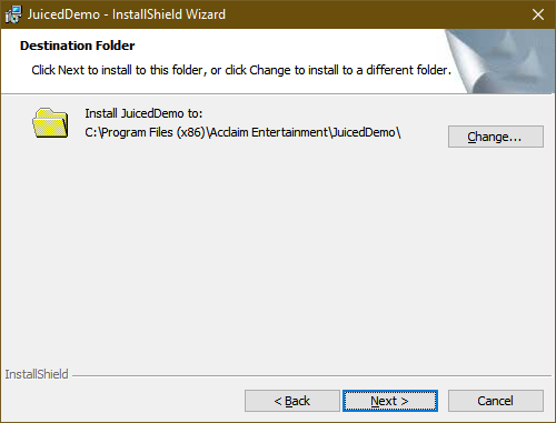 C:\Program Files (x86)\Acclaim Entertainment\JuicedDemo. Destination Folder Transform modifies the installer flow to re-enable